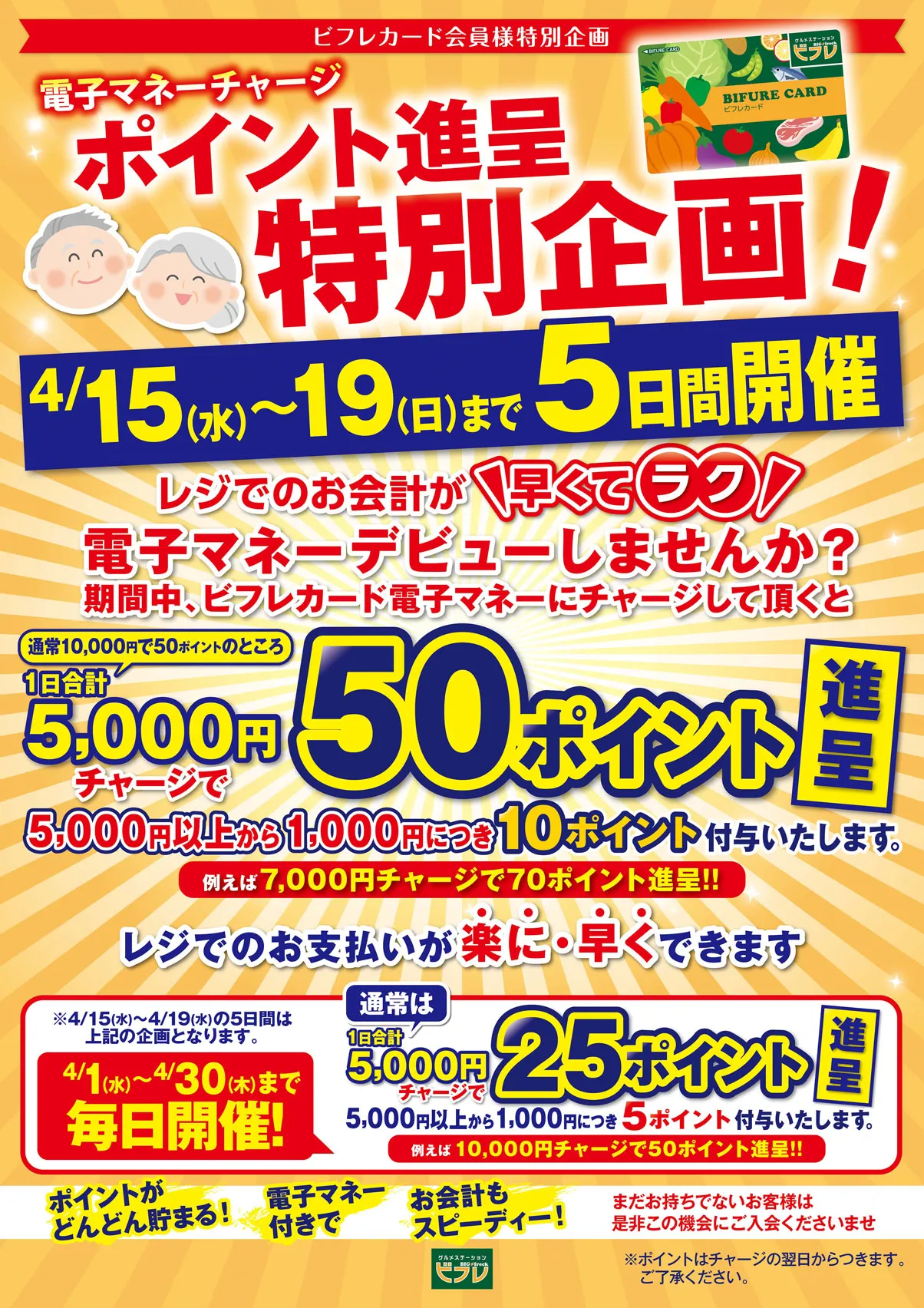4/15(水)~4/19(日)までの期間中に、チャージして頂くと5,000円チャージで50ポイント進呈!